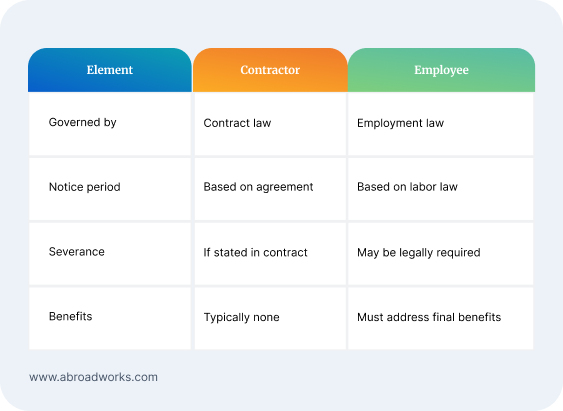 An employee termination letter involves labor laws, notice periods, and benefits obligations. An independent contractor termination letter focuses on contract terms.