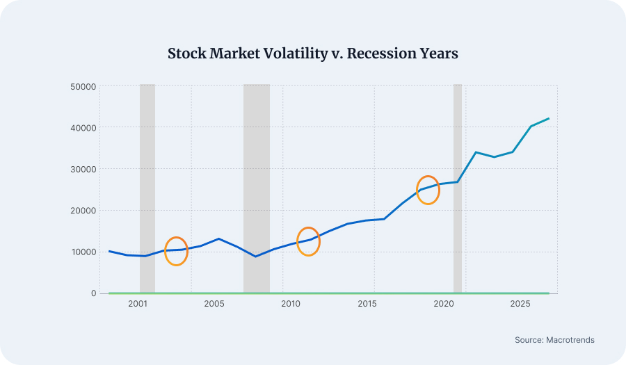Ancient wisdom generally says the line goes up. There are dips here and there, but an upward trend is the norm for the average American who glances at their retirement investments every now and then. As such, sustained gains in the stock market are barely noticed. On the contrary, sustained dips raise eyebrows. Below is a chart of the historical values of the Dow Jones Index with recession years shaded in grey.