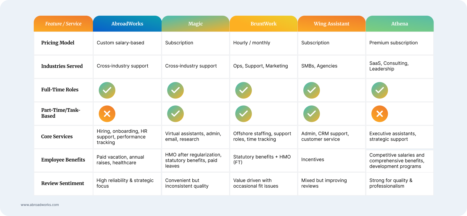If you're aiming to create a dependable offshore team that provides solid support without too much overhead, AbroadWorks is a great choice. On the other hand, if you need quick help with specific tasks, Magic might be the way to go. BruntWork, Wing, and Athena each have unique offerings that suit different budgets and levels of support.